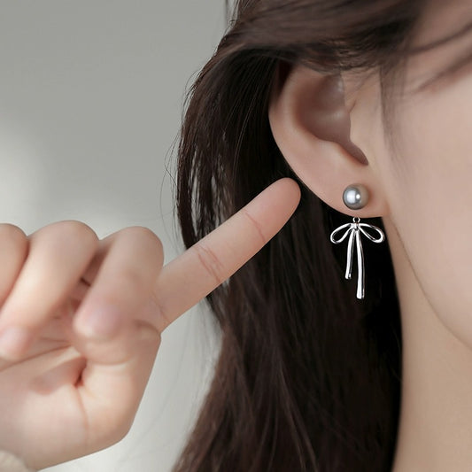 F廠【DQ11276E】S925純銀法式輕奢正圓灰珍珠耳環清冷感蝴蝶結耳環後掛式耳環 25.09-4