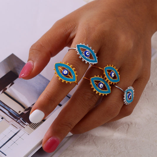 B廠【A191】歐美時尚簡約個性小眾戒指砝碼彩釉惡魔之眼造型鈦鋼開口食指戒女 24.03-4
