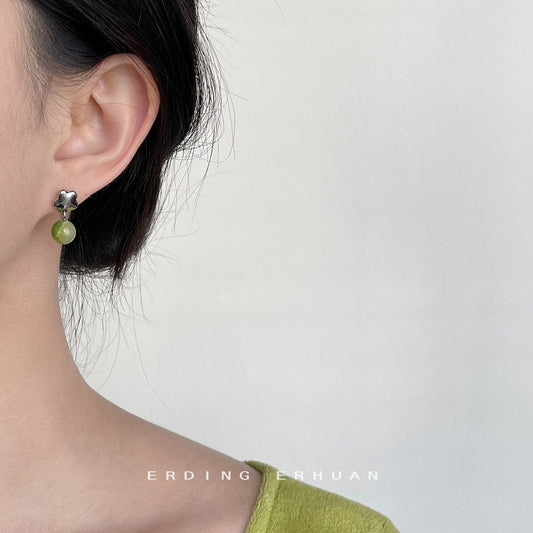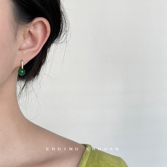 C廠【3852】天然石綠瑪瑙新潮新中式復古幾何圓球耳環耳環女優雅新款耳環 24.04-2