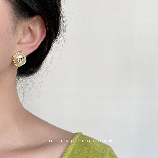 C廠【3863】小香風高級感方形幾何珍珠蝴蝶結鍍14K耳環氣質優雅通勤時尚耳環 24.04-2