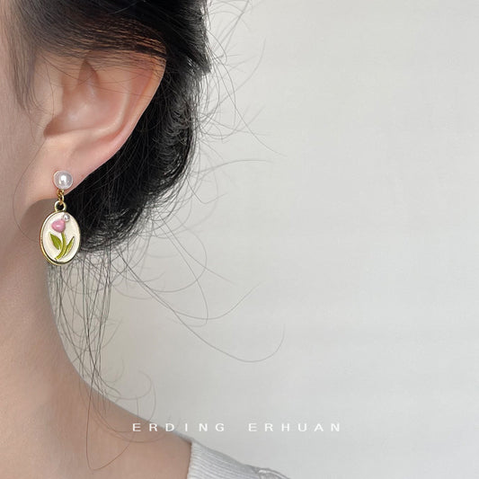C廠【3836】森系小清新鬱金香滴油鍍14K珍珠耳環女優雅甜美新款設計耳環 24.04-2