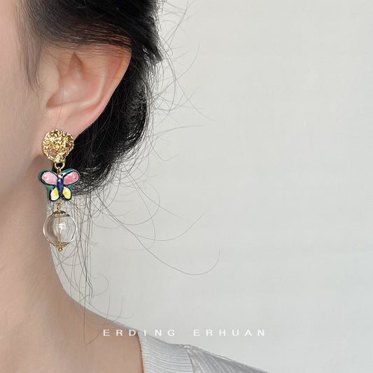 C廠【3832】原創設計藝術氣息不對稱設計師款玻璃氣泡球陶瓷蝴蝶耳飾新潮耳環 24.04-2