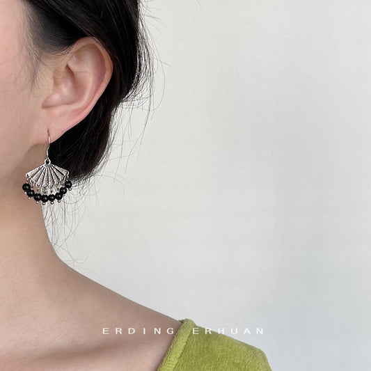 C廠【3855】民族風實物很美~扇形流蘇黑色氣質優雅耳環手工925銀針耳環 24.04-2