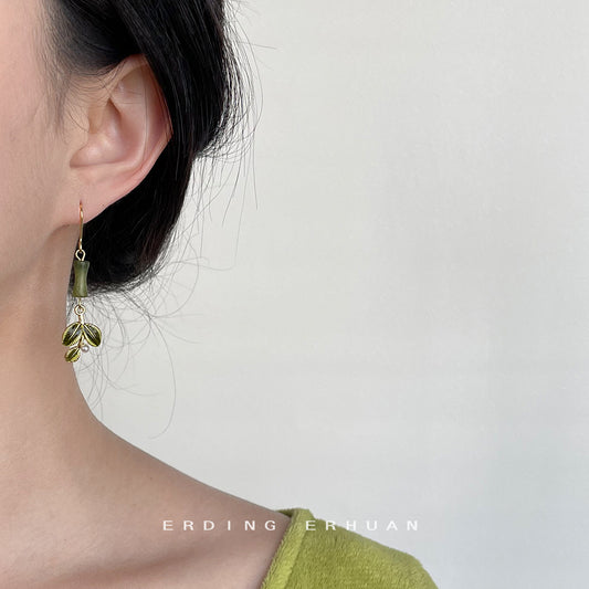 C廠【3869】新中式天然石竹節樹葉手工設計感鍍14K設計師款耳環 24.04-2