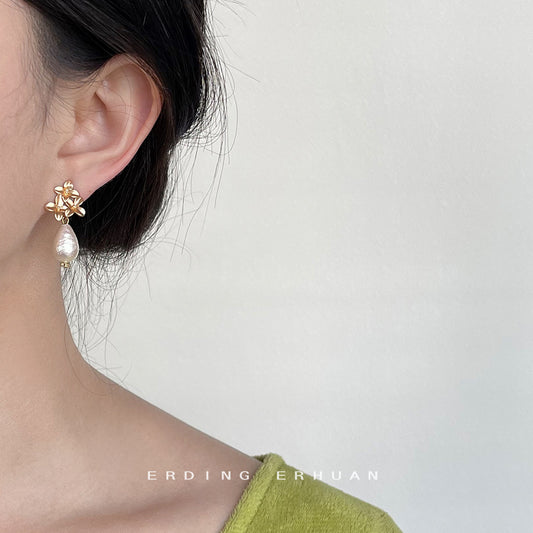B廠【F1348】法式小眾冷淡風幾何飾品花朵造型鑲嵌仿珍珠設計感鈦鋼鍍金耳環 24.04-1