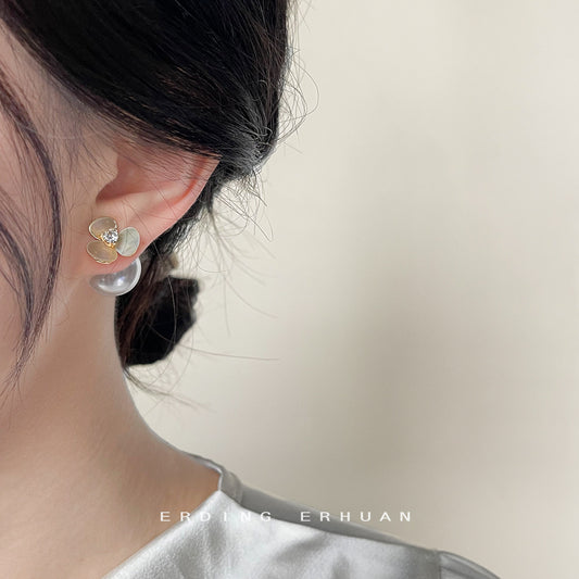C廠【3959】實物很美~真貝殼三葉草鑲嵌鋯石一款兩戴新款優雅耳飾 24.05-3
