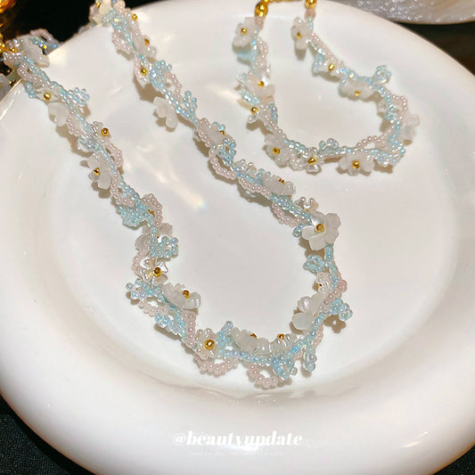 A廠【HN7156】鈦鋼不銹鋼粉藍米珠珍珠花朵手鍊項鍊套裝公主風鎖骨鍊甜美飾品女 24.07-5