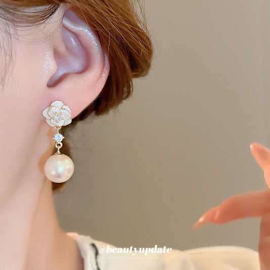 A廠【HE21946】真金電鍍925銀針山茶花珍珠吊墜耳環超仙氛圍感耳環法式唯美浪漫耳環 24.08-3