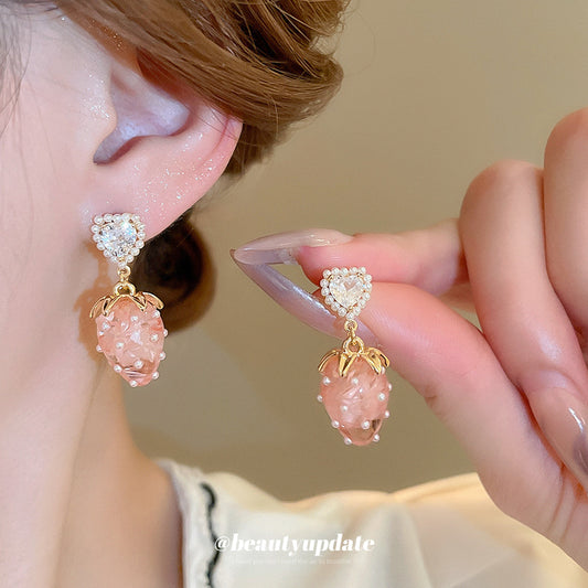 A廠【HE21939】真金電鍍925銀針鋯石珍珠愛心草莓耳環氣質時尚耳環韓國輕奢可愛耳飾 24.08-3