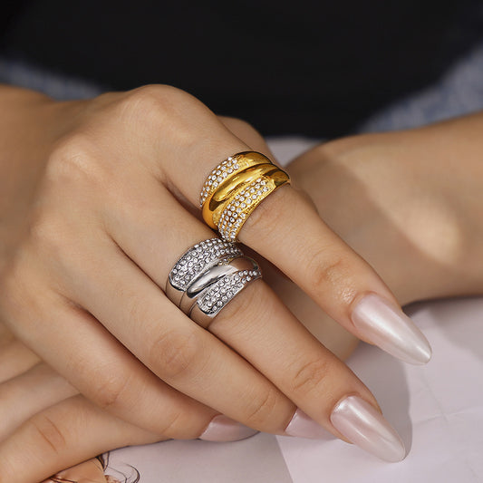B廠【A347】熱銷歐美新款交叉編織鑲多重排鑽戒指鈦鋼鍍18k真金輕奢時髦指環 24.08-2