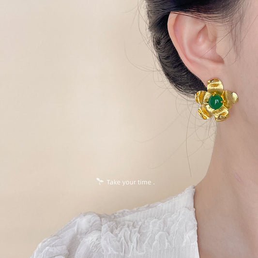 C廠【4788】文藝復古立體誇張大花朵中古風耳飾祖母綠耳環2024年秋季耳環 24.08-5