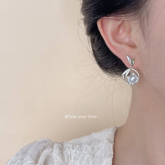C廠【4785】文藝復古原創手工藝設計感荷葉玻璃施家珍珠耳環女長耳環飾品 24.08-5
