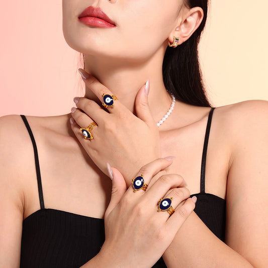 B廠【A920】歐美時尚搞怪藍眼睛指環跨境復古鈦鋼PVD18K真金開口不掉色戒指女 24.09-2