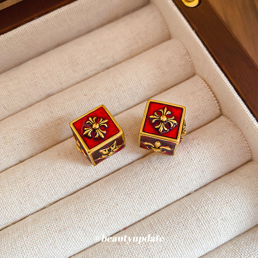 A廠【WE1487】真金電鍍銀針滴油方形花朵耳環中古vintage耳環輕奢高級感耳飾女 25.01-1