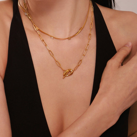 B廠【P1028】OT扣項鍊方形鋯石刀片鏈雙層疊戴時尚不鏽鋼鍍金簡約感配件 25.03-2