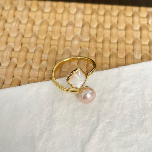 F廠【DQ8312R】S925純銀復古氣質淡水珍珠戒指女小眾設計貝殼銀杏葉開口指環 25.03-2