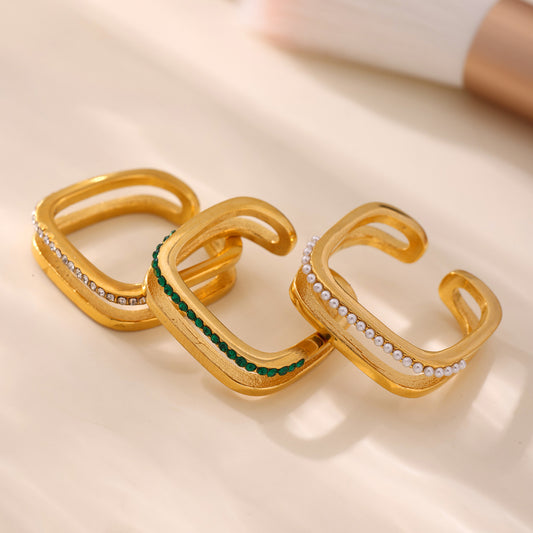 B廠【A094】歐美熱銷款不銹鋼雙層帶鑽貝珠開口不可調整戒指PVD鍍18k金 25.04-1