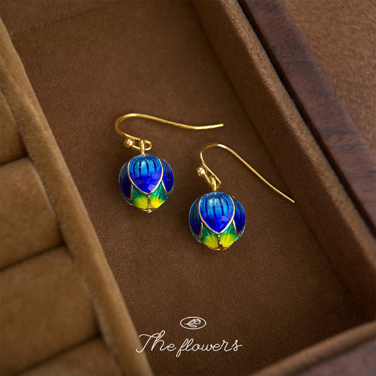C廠【5451】民族風景泰藍滴釉蓮花耳環新中式個性藍色花朵手工復古高級感耳飾 25.04-4