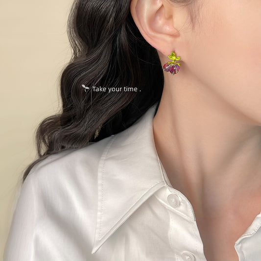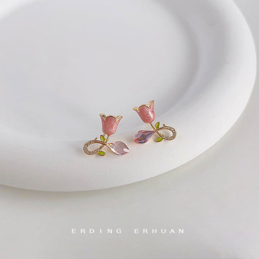 C廠【2268】油畫感甜美鬱金香耳環小眾設計感藤蔓鋯石粉色花朵可愛少女感耳飾 25.04-4
