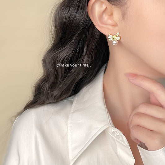 C廠【5863】實物很閃~微鑲鋯石925銀針鍍14K蝴蝶結珍珠耳飾甜美 新款耳環飾品 25.04-4