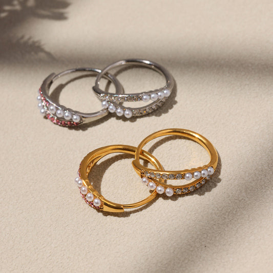 B廠【A030】ins跨境熱銷款幾何雙層貝珠水鑽側開口可調整不鏽鋼戒指女 25.04-4