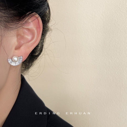 C廠【2958】淡水珍珠扇形耳環微鑲鋯石通勤百搭半圓幾何輕奢高級感氣質耳飾女 25.05-1