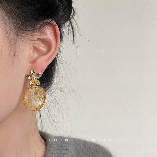 C廠【3493】原創設計撒金箔效果手工幾何耳環新中式立體桃花高級感珍珠耳飾女 25.05-1
