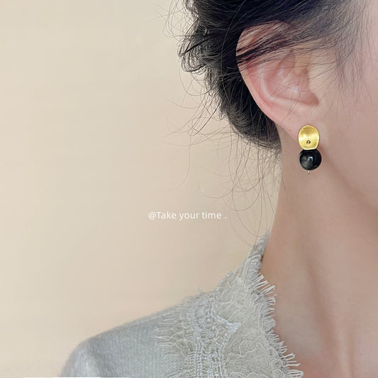 C廠【5073】輕奢黑金天然石耳環高級感大氣拉絲金感手工藝幾何通勤百搭氣質耳飾 25.05-1