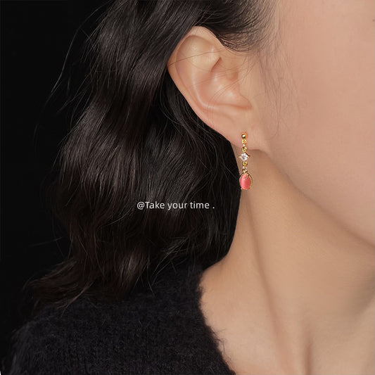 C廠【5583】清新甜美微鑲鋯石玻璃貓眼石水滴耳飾新款簡約幾何玫紅色耳環 25.05-1