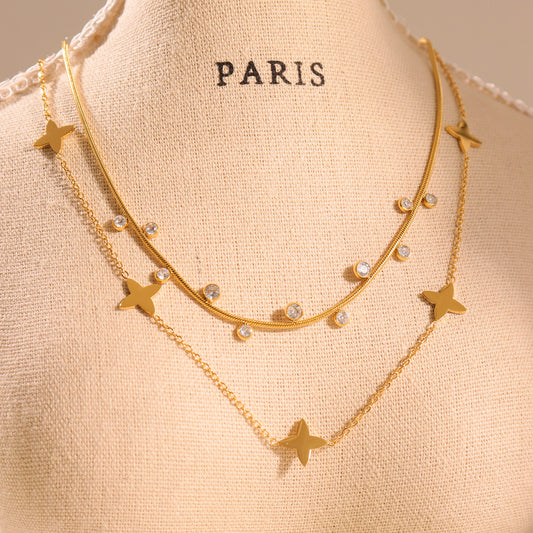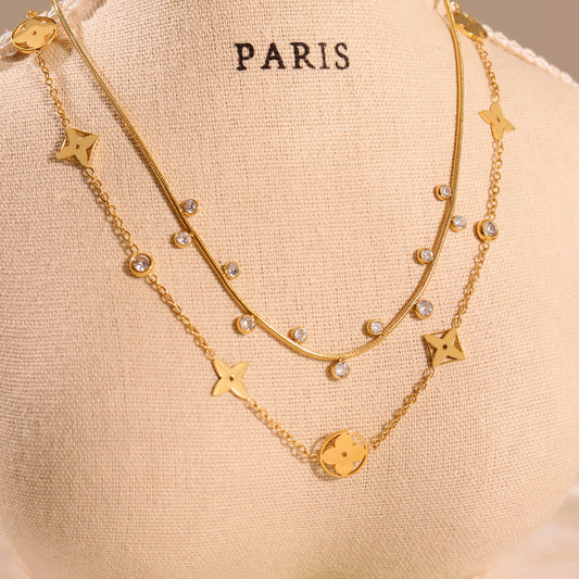 B廠【P1331】歐美ins風飾品不鏽鋼幸運四葉草鎖骨項鍊雙層疊戴鍍18k真金 25.05-2