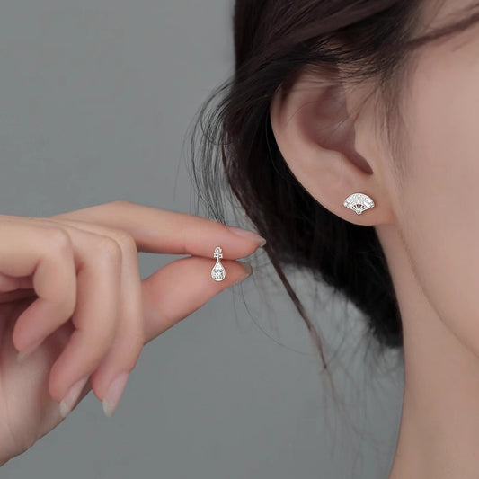 F廠【DQ10821E】足銀999民族風琵琶折扇耳環女新中式不對稱扇子復古國風耳飾 25.05-2