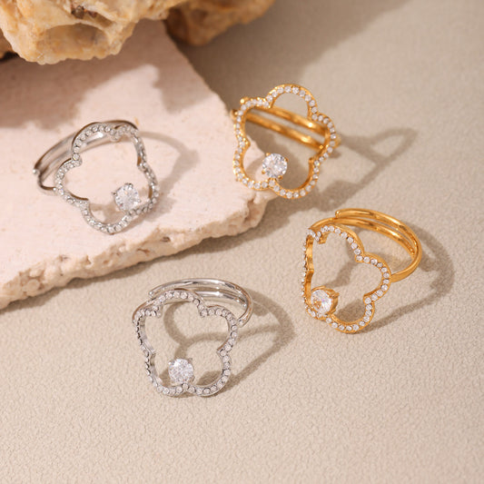 B廠【A745】ins輕奢風5A鋯石小鑽五葉花開口可調式戒指不鏽鋼鍍18k真金 25.05-3