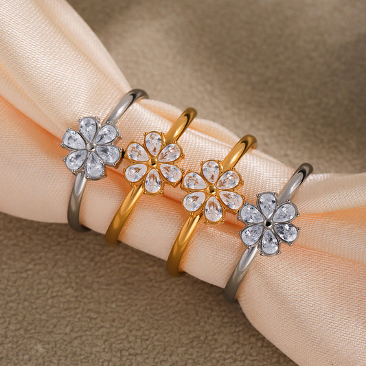 B廠【A749】國潮新款鑲嵌5A鋯石水滴小花開口調整戒指不鏽鋼鍍18k真金 25.05-4