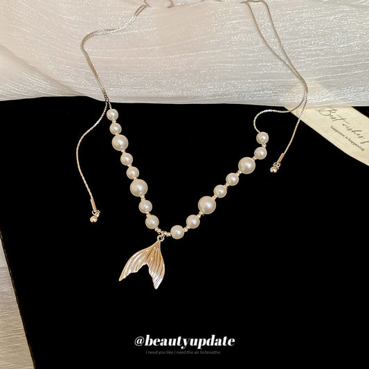 A廠【HN9014】海邊度假風玻璃珍珠魚尾吊墜抽拉式項鍊時尚小眾鎖骨鏈百搭項鍊飾女 25.06-2