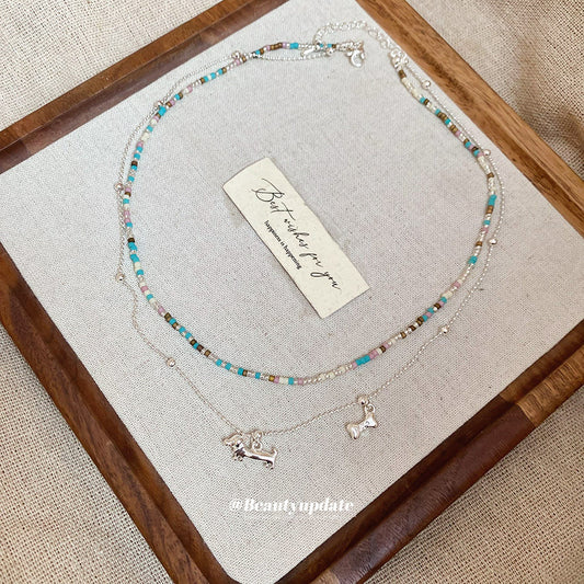 A廠【HN9184】歐美玻璃珠小狗蝴蝶結吊墜雙層項鍊小眾設計感鎖骨鏈個性百搭頸鍊 25.06-2