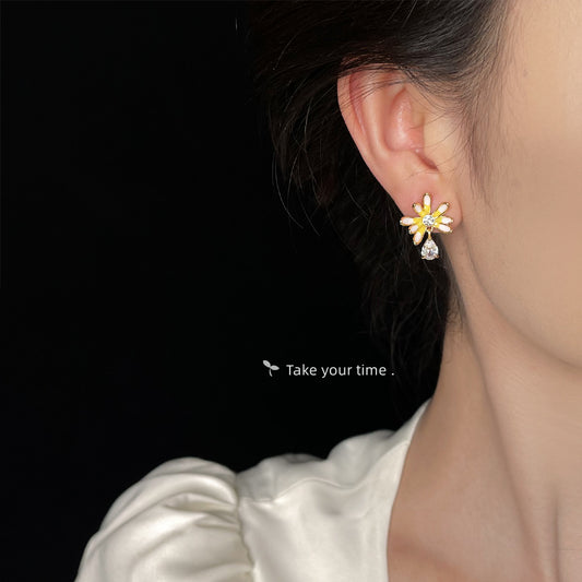 C廠【6228】夏日小清新微鑲焦石925銀針鍍14K琺瑯滴釉漸變色亮黃雛菊菊耳飾耳釘 25.06-2