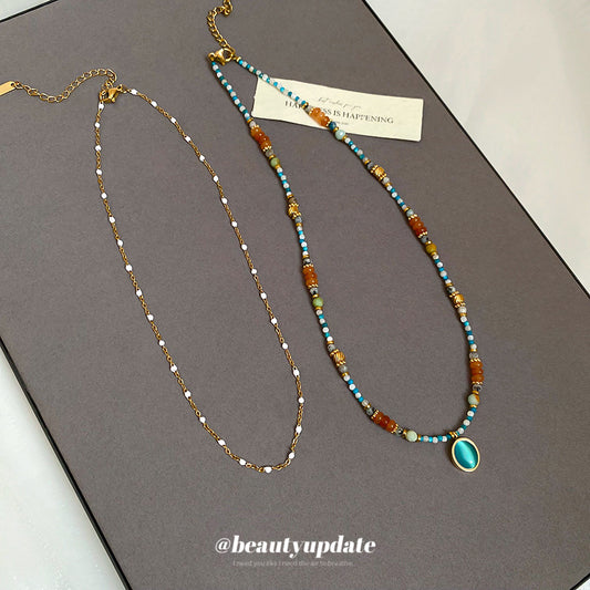 A廠【HN9067】復古鈦鋼貓眼石瑪瑙橢圓形吊墜項鍊時尚簡約鎖骨鏈輕奢高級感頸鏈 25.06-2