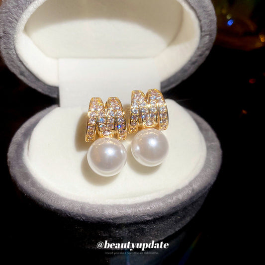 A廠【HE27444】925銀針鋯石字母M珍珠吊墜耳環輕奢高級感耳環時尚耳環設計感小眾女 25.06-4