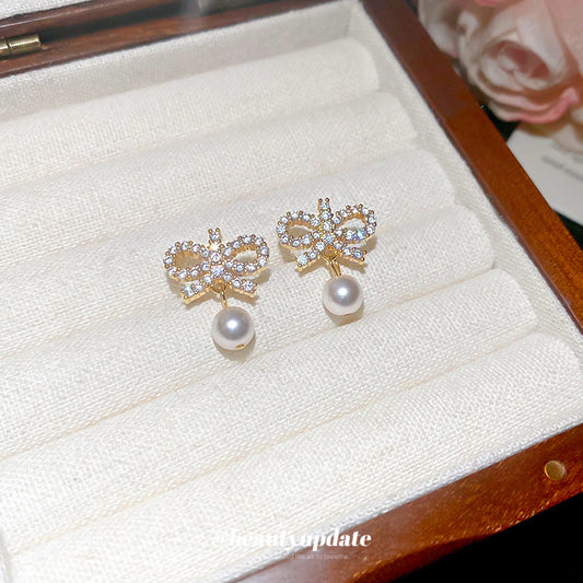 A廠【HE27443】925銀針鋯石蝴蝶結珍珠吊墜耳環法式輕奢風鋯石耳環小眾設計感耳飾女 25.06-4