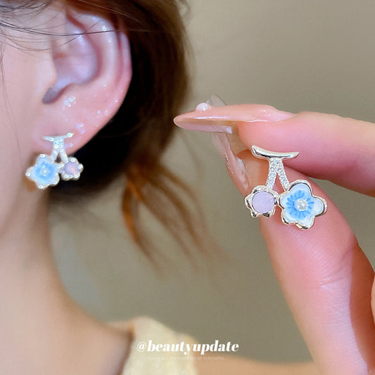 A廠【HE27411】925銀針鋯石滴油櫻桃花朵珍珠吊墜耳環清新甜美耳環輕奢高級感耳飾女 25.06-4