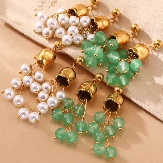 B廠【F1422】天然綠東陵石貝珠流蘇小葡萄造型耳環不鏽鋼18k鍍金耳環女 25.07-1