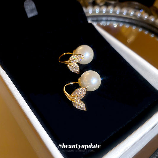 A廠【HE27710】鋯石魚尾樹葉珍珠吊墜耳鉤時尚優雅氣質精緻耳環輕奢高級感耳飾女 25.07-2