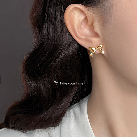 C廠【6653】設計師~原始縫合裂痕蝴蝶結925銀針鍍14K個性ins創意耳環耳飾 25.08-5