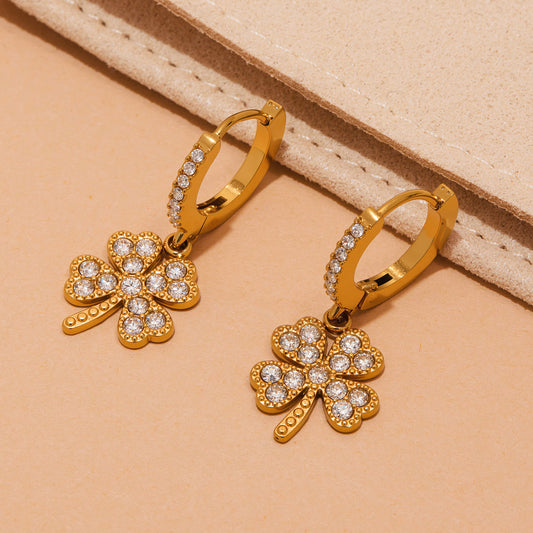 B廠【Q104】跨國新品不鏽鋼幸運草帶鑽耳墜耳環鍍18k真金簡約時尚飾品 25.08-5