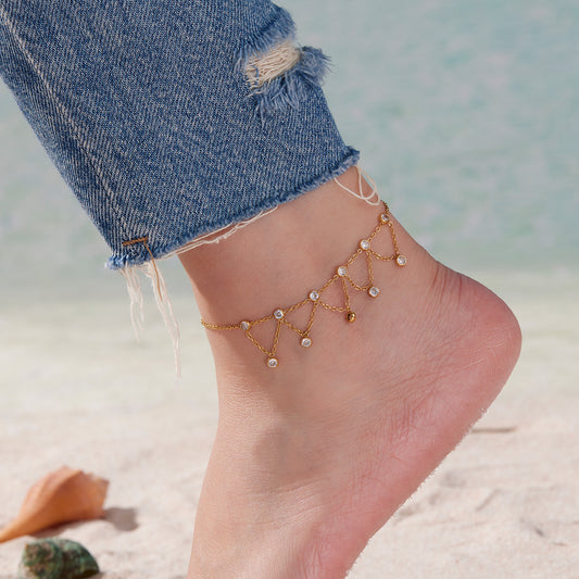 B廠【S030】ins小眾鏈條流蘇鋯石腳鍊歐美跨境新品雙層不鏽鋼鏈條飾品 25.09-1