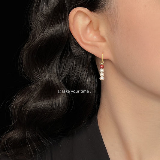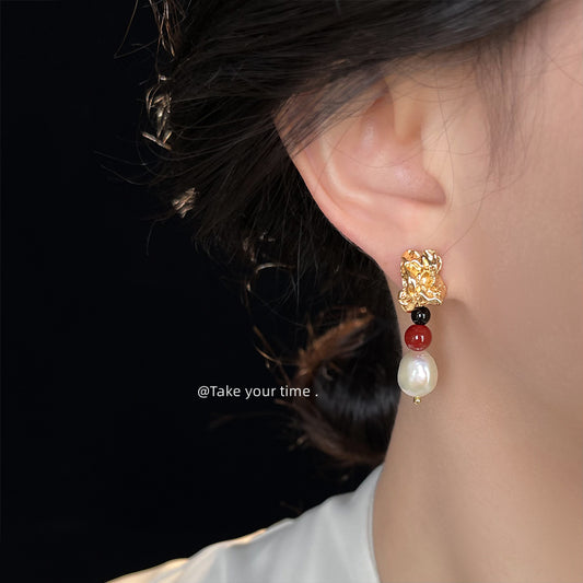 C廠【6519】淡水珍珠楠紅瑪瑙文藝復古手工新款耳環民族風飾品新款耳環女 25.09-1