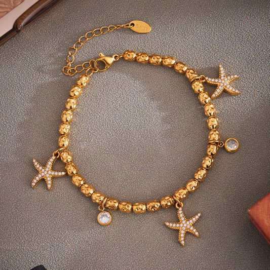 B廠【E155】精緻多配件鈴鐺八芒星吊墜鑲鋯石手鍊組合不鏽鋼鍍18k真金 25.09-1