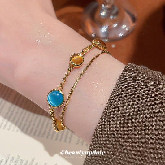 A廠【WB1617】18k真金電鍍貓眼石圓形雙層手鍊復古宮廷風手環輕奢高級感手飾女 25.09-3