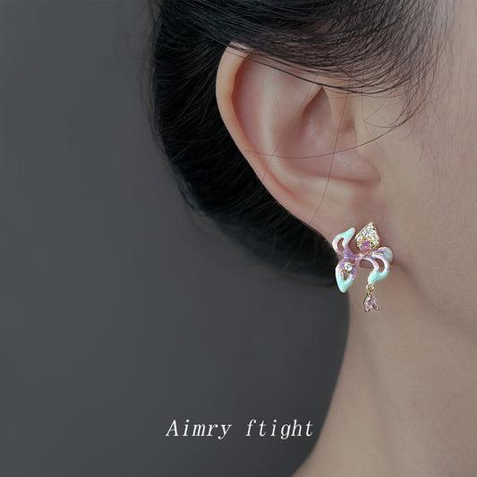 C廠【6863】【鳶尾花系列】~原創925銀針微鑲鋯石琺瑯滴釉彩繪花朵耳釘耳飾女 25.10-1