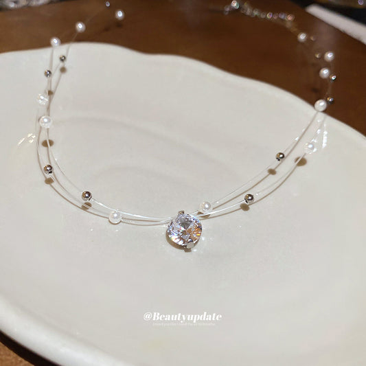 A廠【WN1474】鋯石珍珠串珠幾何圓形吊墜雙層項鍊冷淡風鎖骨鏈輕奢高級感項鍊飾女 25.10-3
